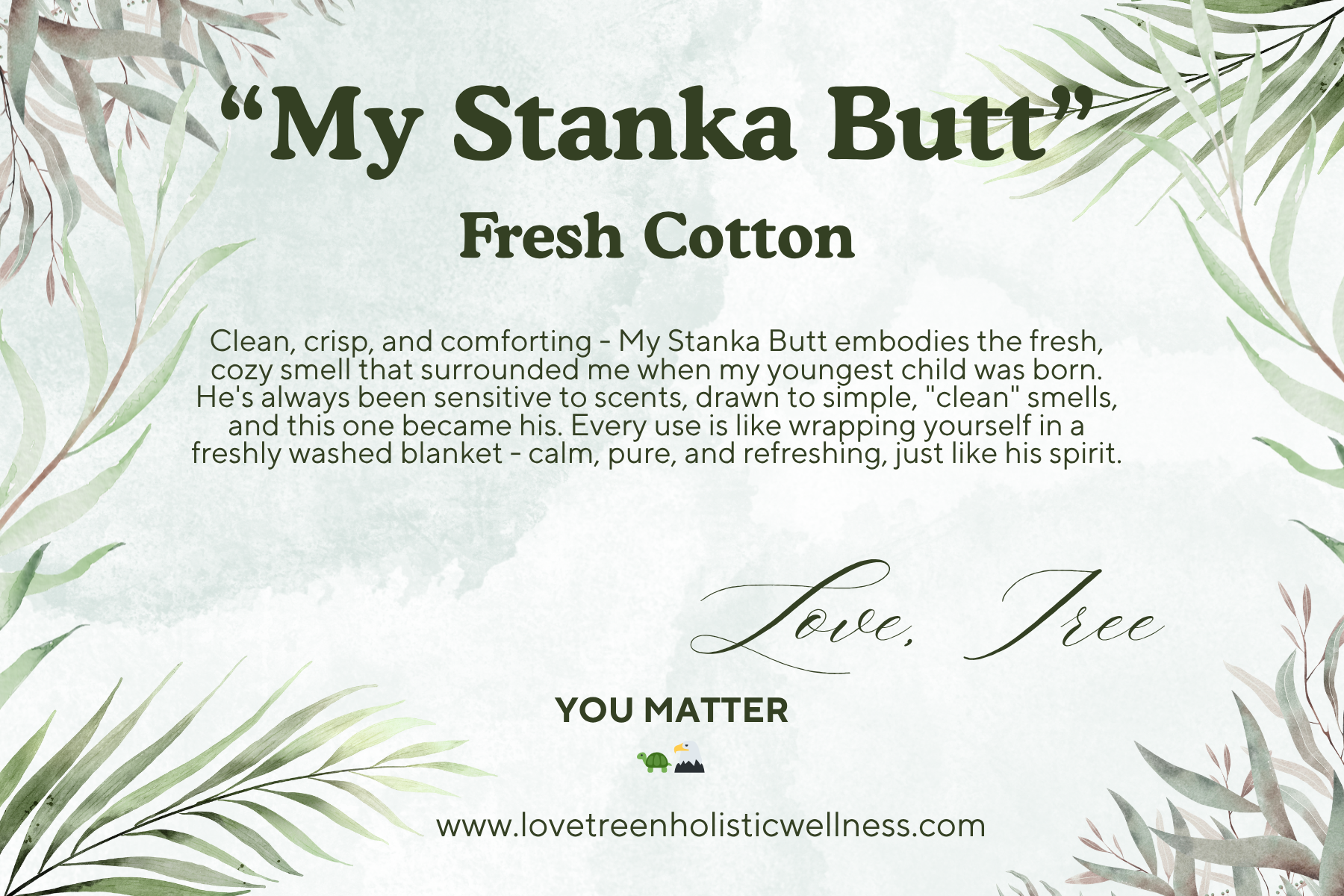 Soft, clean, and refreshing, this gentle body butter deeply moisturizes while leaving a subtle scent of freshly washed linen. Inspired by my youngest son’s love for clean, simple smells, My Stanka Butt captures that pure, comforting essence that soothes both the skin and the spirit.